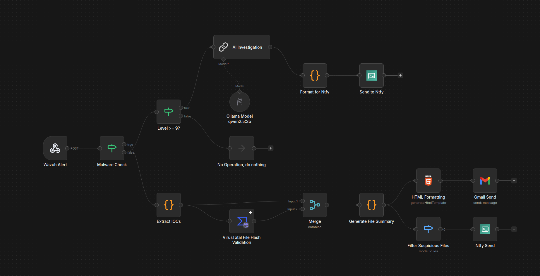 In this stage, certain data (agent name/IP, rule ID, filepath, etc.) is assigned to variables to be used by the next two nodes.